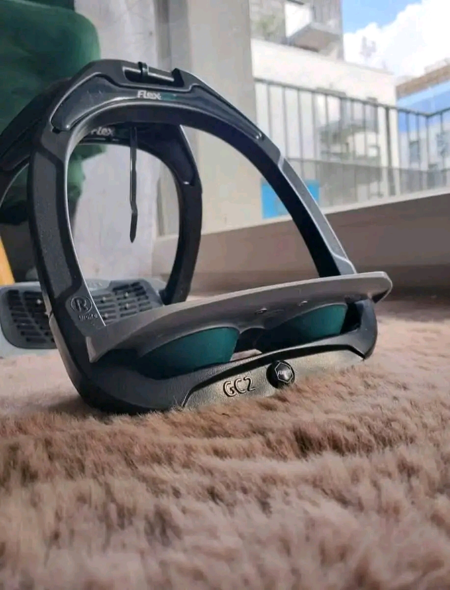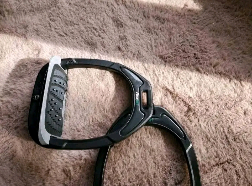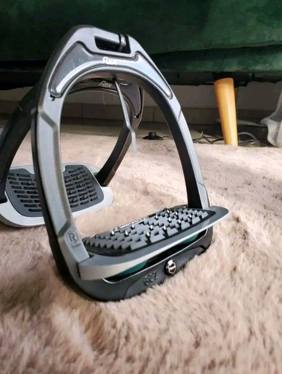 À vendre étriers Flex-On Green Composite avec plancher incliné ultra grippant, offrant une excellente stabilité et un confort optimal à cheval.